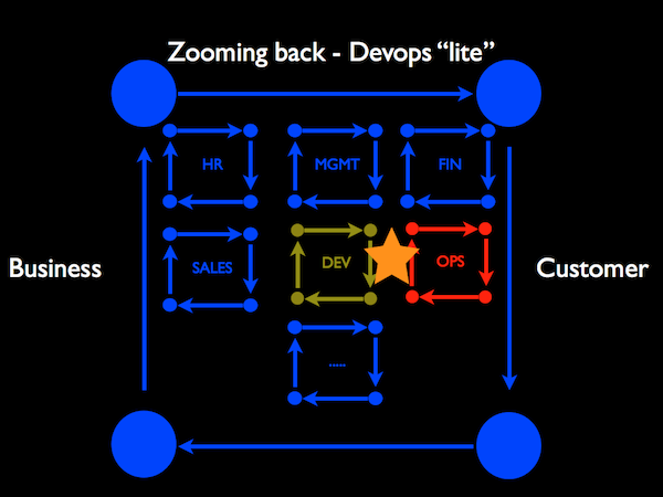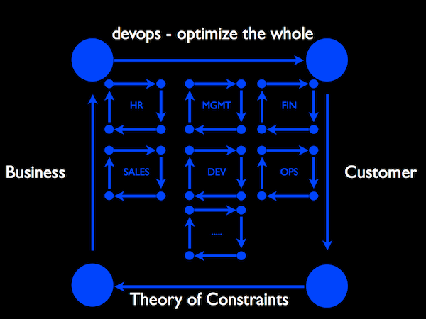 As rightly pointed out by Damon Edwards , devops is not about a technology , devops is about a business problem. The theory of Contraints tells us to optimize the whole and not the individual ‘silos’. For me that whole is the business to customer problem , or in lean speak, the whole value chain. Bottlenecks and improvements could be happen anywhere and have a local impact on the dev and ops part of the company.
