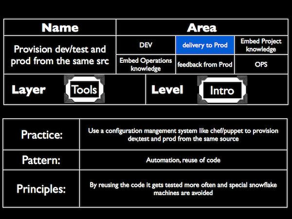 This blogpost is a first stab at providing a structure to codify devops practices. The wording, descriptions are pretty much work in progress, but I found them important enough to share to get your feedback.