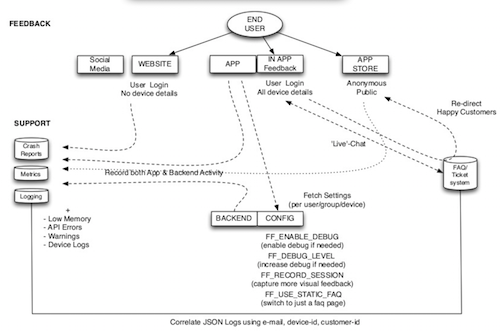 If you don’t want to wait for the user to create a ticket why not send all the mobile analytics and logs to your systems in a batched way. For example you can detect issues with your ads system or facebook login , things you can’t check easily with just backend monitoring. Plugins like New Relic allow you to track memory , CPU and API errors as seen from on the mobile device and warn you even if your backend is all green. Many logging services allow you directly stream mobile device logs to your logging service. This allows you to easily compare server and mobile device logs when debugging issues. Using feature flags you can increase the mobile device log level based so you can get more data from similar users in the wild to better debug the issue.